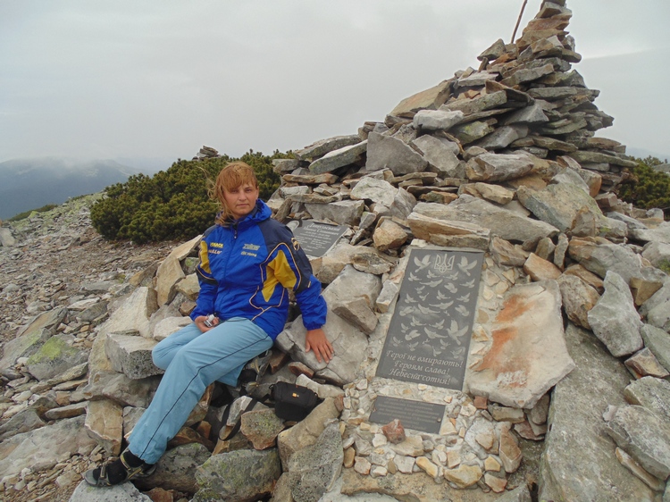 А пока мы штурмуем Грофу. Позади остались деревья и мы вошли в царство жереба и камней. Последние сотни метров тропы вообще небыло видно, поэтому шли по старым добрым "турам" (башенки камней, обозначающие маршрут) — прямо как на Кавказе )) На вершине видно было мало, куча мемориальных плит, флаг "рiдної неньки" и пронизывающий ветер. Бедные Любчик и Галинка начали подмерзать. Перед спуском я настоял, чтобы девочки переоделись в ботинки, после чего попытались сделать пару звонков и побежали вниз.