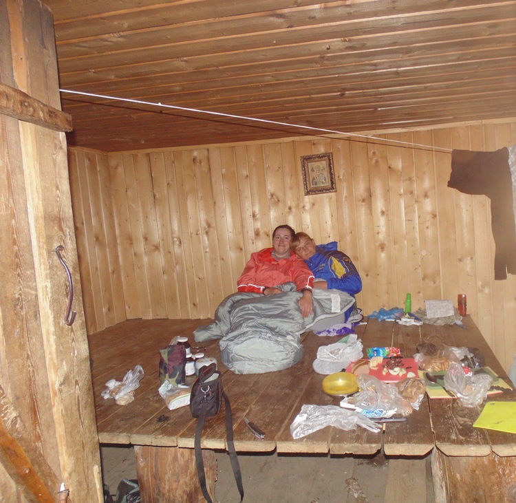 Пока я беседовал с Миколой, девченки  подоставали из рюкзаков вещи, увидели последствия отсутствия штормовых чехлов при таком ветродожде и боевой дух у моих косуль пошатнулся. Они вкрадчиво спросили, можем ли мы остаться здесь просушиться, и получив согласие радостно побежали облагоустраиваться. Прочитав в книге отзывов (местном Фейсбуке) о том, что установленные вместо вышедшей из строя стационарной печи буржуйки очень забиваются, особенно местными смолистыми дровами. К этому прилагалась подробная инструкция, по прочистке, чего делать очень не хотелось — лето все таки на дворе. Но чуть ниже был пост о том, что именно в нашей комнате эта процедура была произведена неким добрым самаритянином. Вот оно, очередное проявление священного хода Походной Фишки. Я пошел к нам в комнату и засунув скомканые остатки японского кросворда поджег, чтобы проверить наличие тяги. Вроде забрезжила надежда на то, что девочки не подерутся за мой единственный сухой спальник. Осталось где-то взять сухих дров в этом царстве дождя и тумана. Поскольку мы все делали правильно и Походный Бог был за нас, Микола вчера еще напилял превосходных дров. Правда они были слегка влажноваты, пролежав ночь и полдня под дождем. Ну и что, если есть нож. Им всегда можно из мокрого полена наколоть сухих щепок. Немного дыма и буржуечка к нашей радости начала сушить мокрые спальники, попутно нагревая наше жилище. Жизнь налаживается.