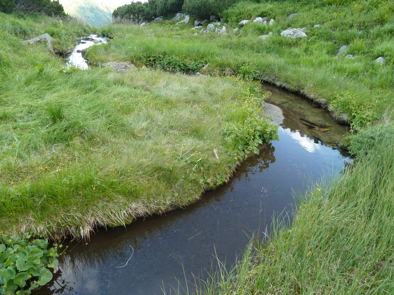 С вершины горы Мика Маре было видно интересное русло речки, которая пробегает по долине и прячется под кроной леса. Одинокие брылы камней, поскатывавшиеся вниз, да кусты можжевельника дополняют этот завораживающий пейзаж.