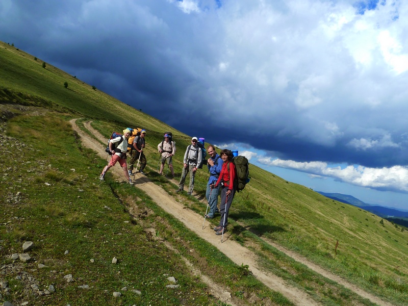 Вышли на полонину, залитую солнцем, а впереди нависли черные тучи… И в них ведет дорога… Так красиво! Это невозможно передать словами. Жаль, что я не художник. К тому же не так много времени, чтобы наблюдать эту красоту. Мы сделали несколько фоток и пошли той дорогой в тучи…