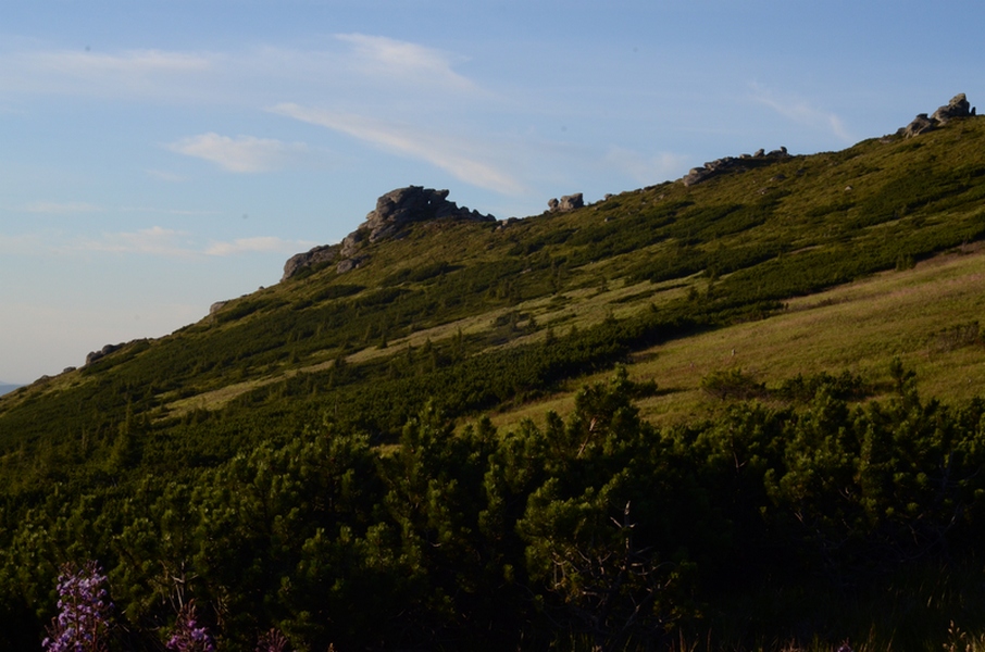 По самой полонине было достаточно полого, а потом начался довольно крутой подъем вверх. Скоро деревья закончились, а склоны поросли можжевельником.