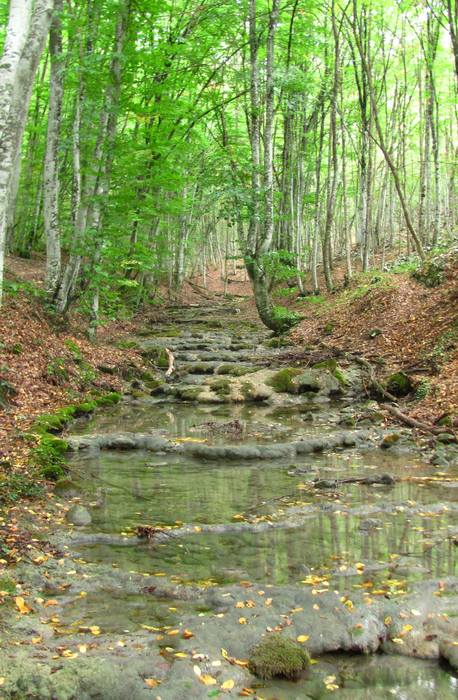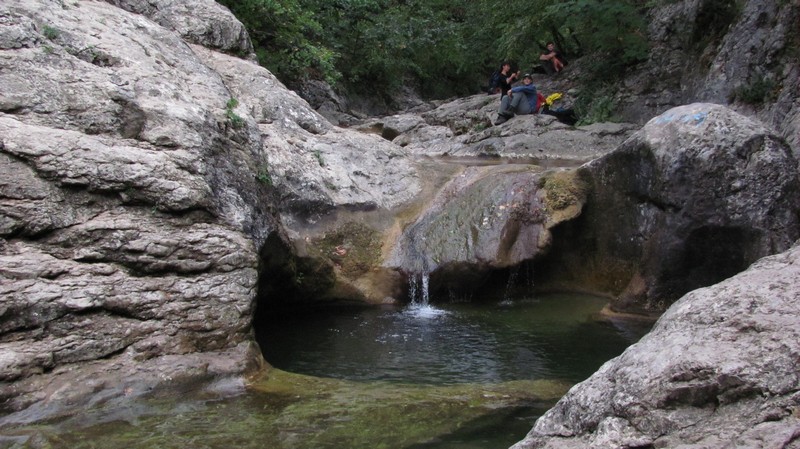Водопады на Черной рекеВ селе мы воспользовались преимуществами цивилизации — слопали по мороженому, и в 2 часа дня вышли к Узундже. Сухое русло вдоль дороги настораживало после полноводного Чернореченского. А поскольку воды с собой было мало, то пообедав без чая в каньоне мы отправились на стоянку Ай-Дмитрий за водой. Там нас поджидала неприятная новость: кордон Ай-Дмитрий с 2010 года закрыт для остановки туристов. Поэтому пришлось чесать еще несколько километров до Чайного домика.